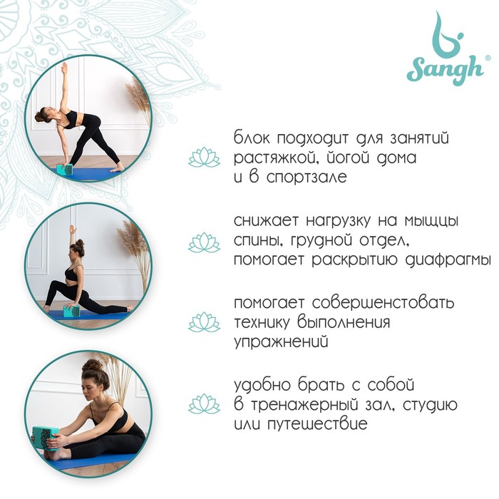 Йога-блок (йога-кирпич) применяется для создания дополнительной точки опоры. Он помогает развивать гибкость постепенно, без лишнего напряжения в мышцах и суставах. Необходим для тех, кто только начинает заниматься йогой, и кому не хватает гибкости, чтобы иметь правильную опору для рук и ног при выполнении асан.