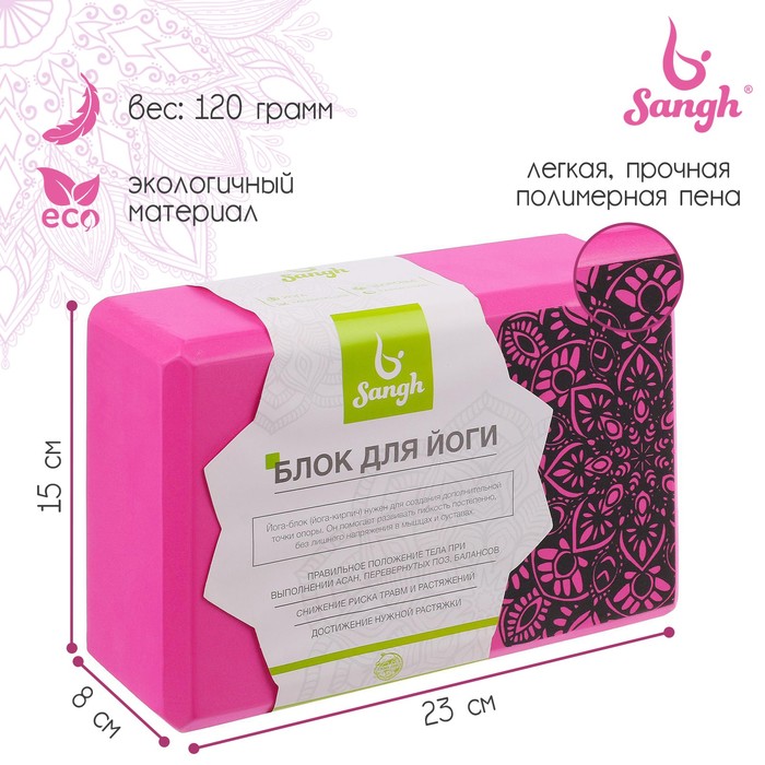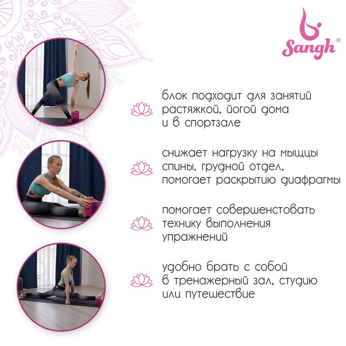 Йога-блок (йога-кирпич) применяется для создания дополнительной точки опоры. Он помогает развивать гибкость постепенно, без лишнего напряжения в мышцах и суставах. Необходим для тех, кто только начинает заниматься йогой, и кому не хватает гибкости, чтобы иметь правильную опору для рук и ног при выполнении асан.
