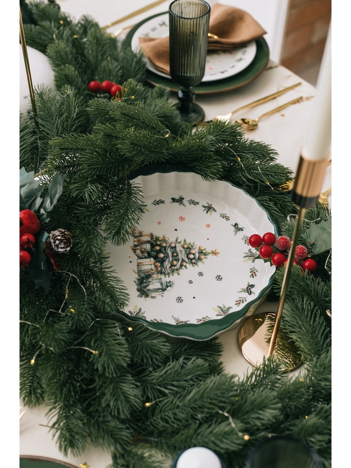 Новогоднее блюдо для запекания «Приближение чуда» — не просто форма для духовки, а переход между кухней и праздничным столом. Его белая керамическая поверхность с лёгким праздничным рисунком не прячется под фольгой — оно выходит на стол как часть сервировки. Объём 1 литр и высота борта 4,3 см рассчитаны на запеканки, овощи под сырной корочкой или порционные кушанья — без переливов, без спешки, без потерь аромата.
