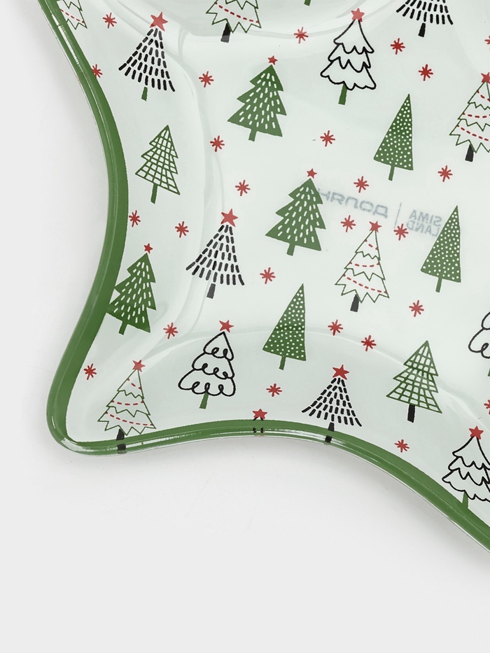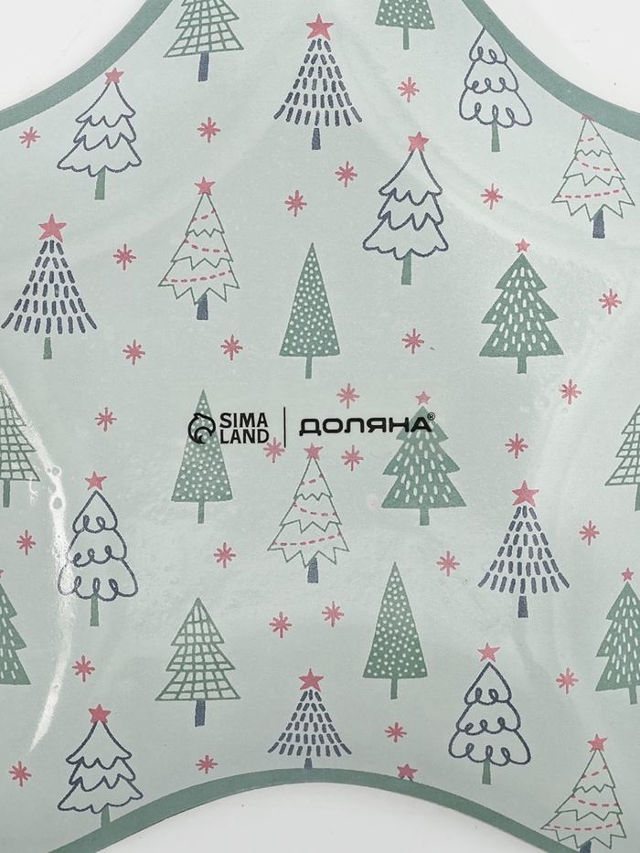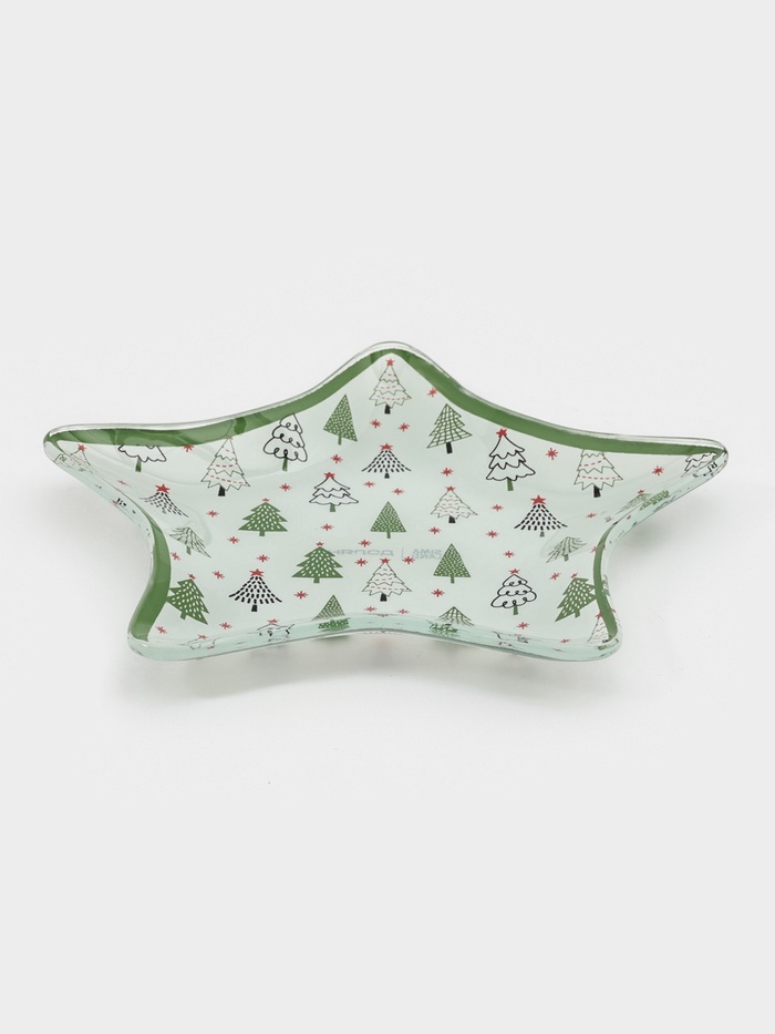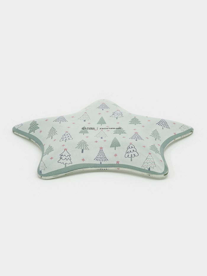 Маленькая ёлочка — большой праздничный акцент! Сервировочное блюдо — стеклянная тарелка в форме звезды диаметром 15 см с новогодним рисунком в бело-зелёной гамме.