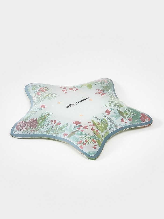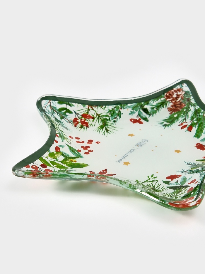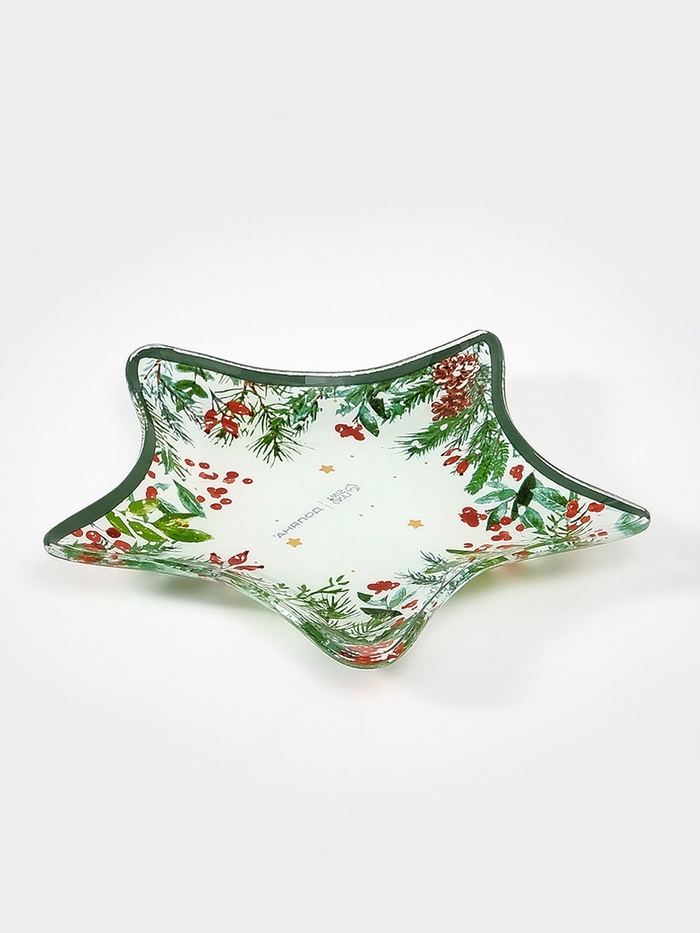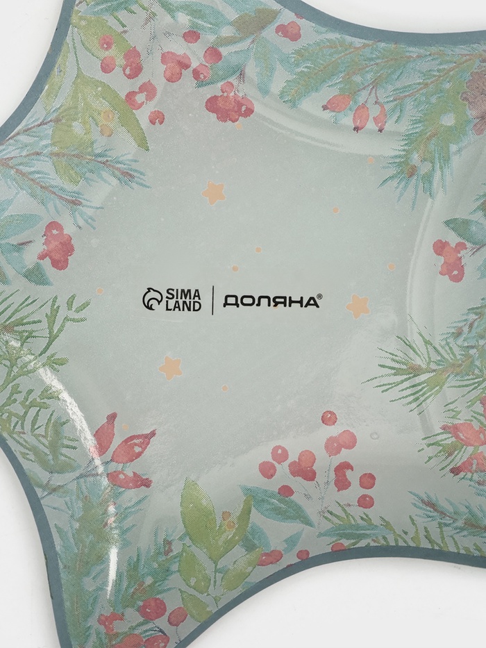 Маленькая звезда — большой праздничный штрих! Сервировочное блюдо — стеклянная тарелка в форме звезды диаметром 15 см с новогодним рисунком в бело-зелёной гамме.