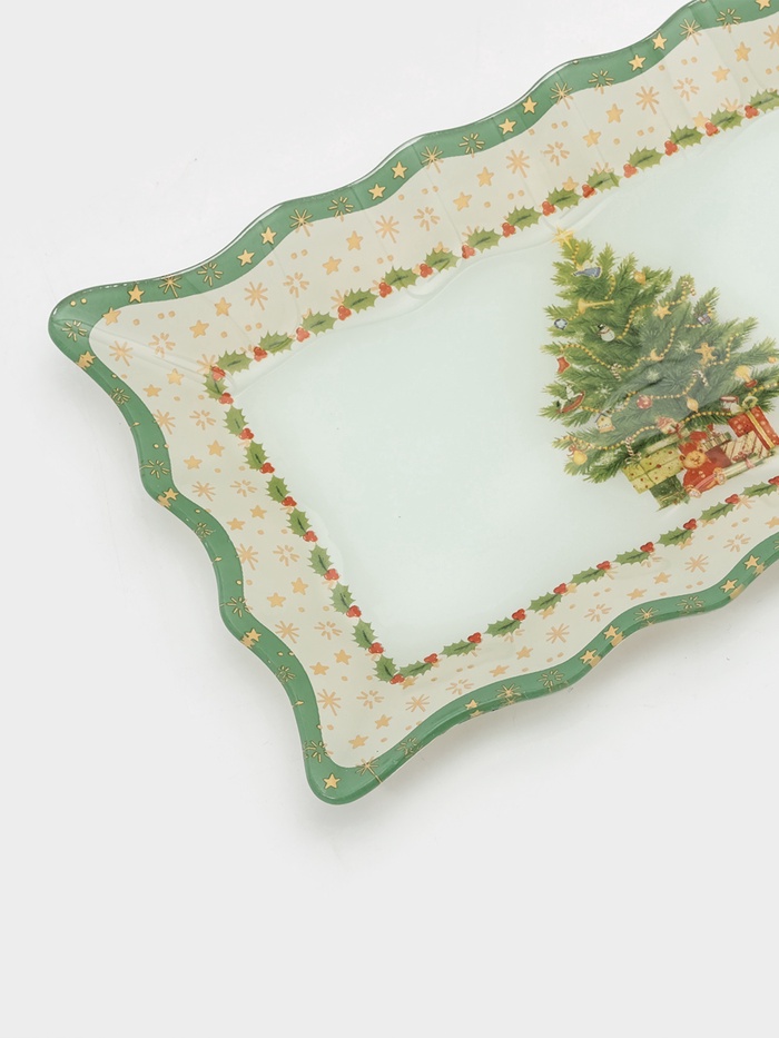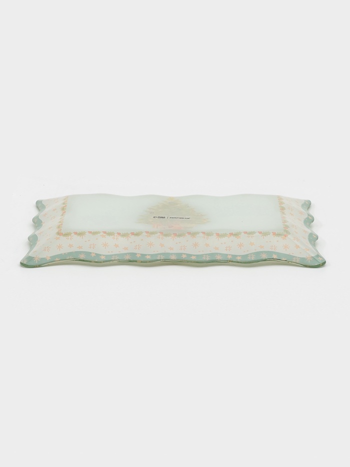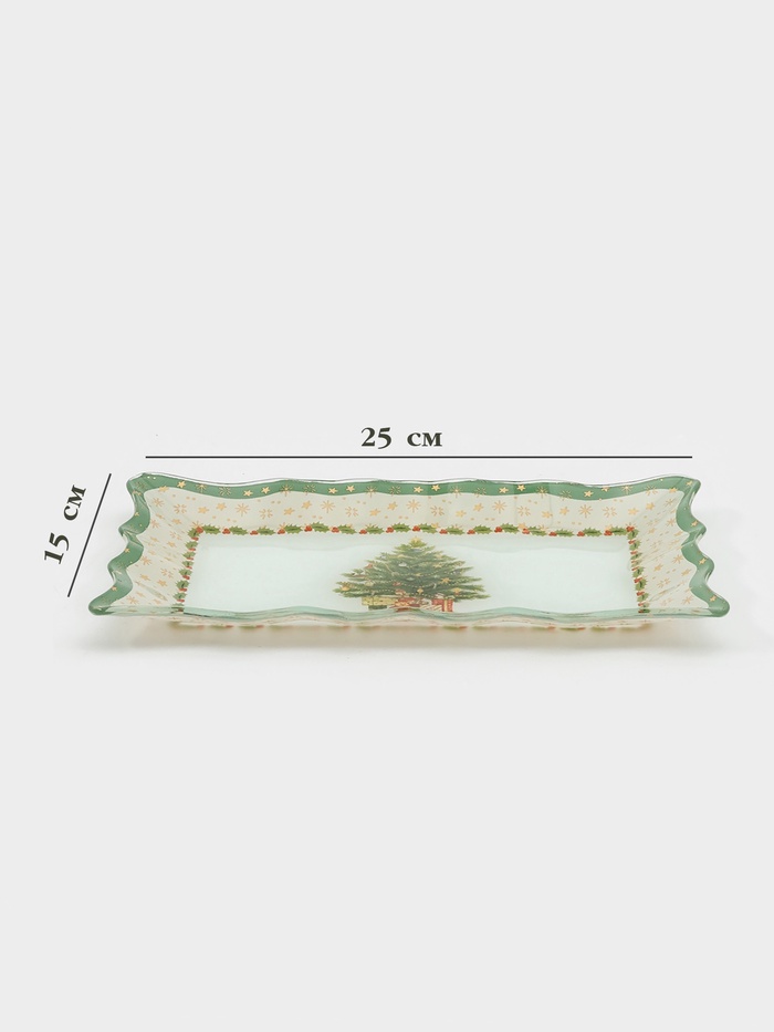 Пусть на столе заиграет зима! Сервировочное блюдо — это прямоугольная стеклянная основа с лаконичным новогодним рисунком в бело-зелёной гамме. Оно создано для подачи угощений и одновременно работает как элемент праздничного декора.