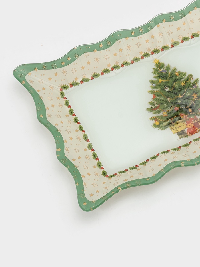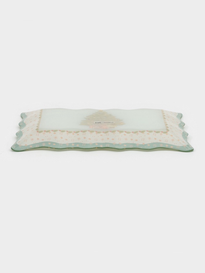Пусть на столе заиграет зима! Сервировочное блюдо — это прямоугольная стеклянная основа с лаконичным новогодним рисунком в бело-зелёной гамме. Оно создано для подачи угощений и одновременно работает как элемент праздничного декора.