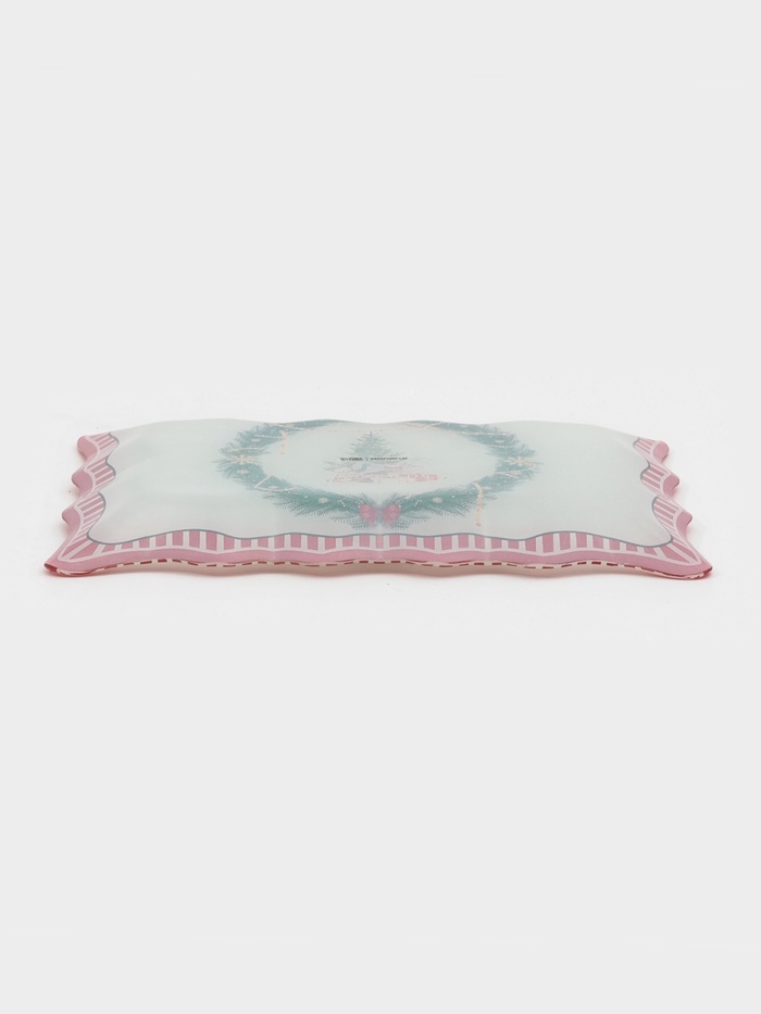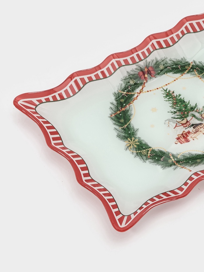 Праздник начинается с сервировки! Сервировочное блюдо — это прямоугольная стеклянная основа в бело-красной гамме с новогодним рисунком, созданная для того, чтобы подчеркнуть дух зимних праздников.