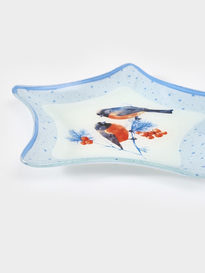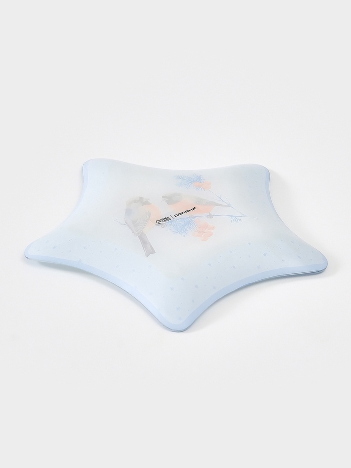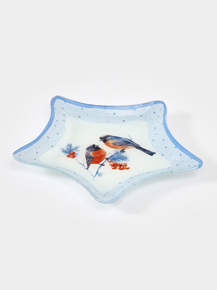 Новогоднее настроение — в каждой детали сервировки! Сервировочное блюдо — это изящная голубая звезда из стекла, украшенная тонкой зимней графикой. Оно не просто подаёт угощения — оно создаёт атмосферу праздника на вашем столе.