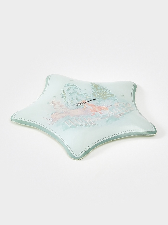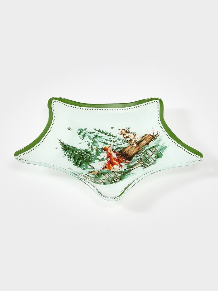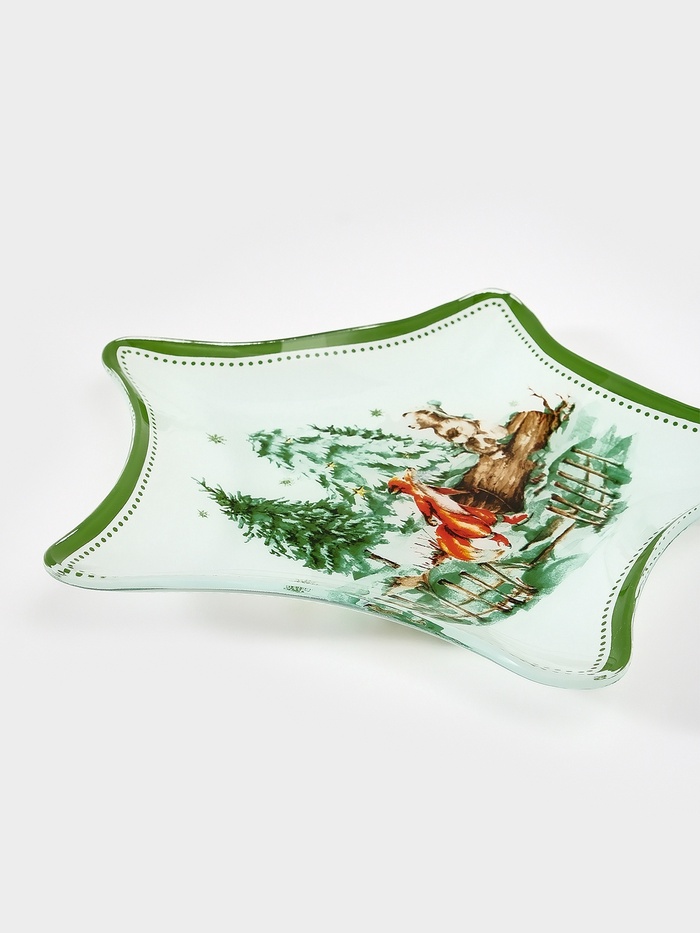 Праздник — в деталях, а уют — в лесных мотивах! Сервировочное блюдо — это фигурное стеклянное блюдо с новогодним рисунком в бело-зелёной палитре.