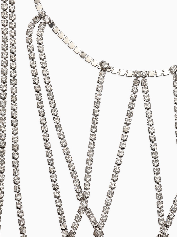 Придайте своему образу пикантную изюминку с стильным бодичейном «Ярусы». Искрящиеся стразы рассыпаются на талии подобно небесным огням фейерверка, притягивая восхищённые взгляды и вызывая улыбки. Оттенок серебристого металла подчеркивает их чистоту и прозрачность, представляя изделие в самом выгодном свете.
