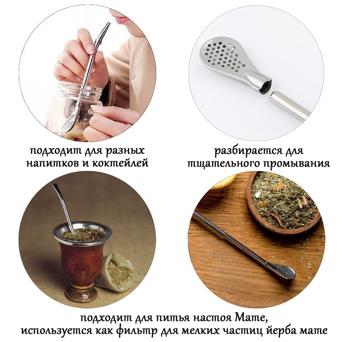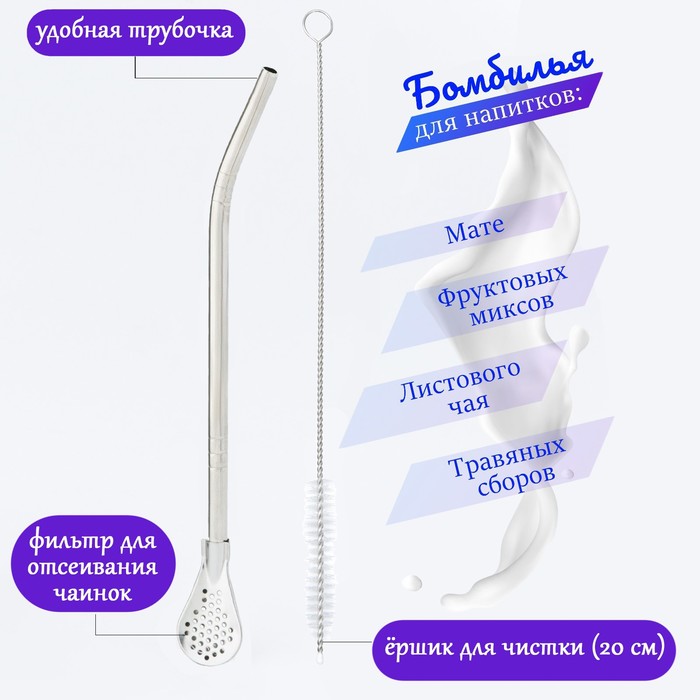 По традиции, аргентинский чай Йерба Мате пьют из специальных сосудов (калабаса) через трубочку с отверстиями для фильтрации мелкой фракции листа (бомбилья). Но в наши дни эта конструкция стала популярна так же для самых разных напитков: фитосборов, фруктовых и ягодных миксов, цветочного чая, каркаде, привычного листового чая и т.д. Бомбилья - отличная замена пластиковым трубочкам для любых коктейлей тем, кто заботится об окружающей среде.