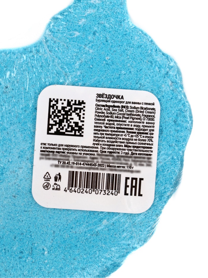 Бурлящий единорог для ванны «Звёздочка» FABRIK Cosmetology, 110 г — это маленькое чудо, которое превращает купание в сказку. При соприкосновении с водой единорог бурлит, создавая нежную пену, наполняет ванную приятным морским ароматом и окрашивает воду в мягкий голубой цвет с переливами шиммера. «Звёздочка» подарит позитивные эмоции, радость и атмосферу волшебства каждому купанию.