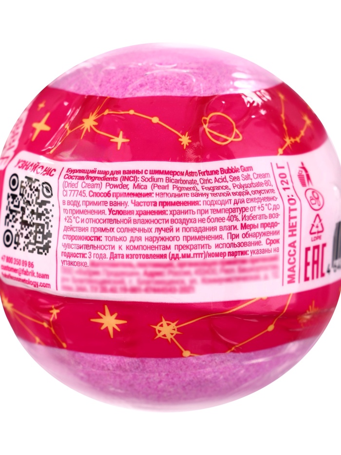Бурлящий шарик для ванны с шиммером «ASTRO FORTUNE Bubble Gum» FABRIK Cosmetology, 120 г — это взрыв веселья и магии прямо в вашей ванной. При соприкосновении с водой шарик бурлит, создавая мягкую пену, а шиммер придаёт воде волшебное сияние с яркими переливами, словно вы находитесь на фантастической планете. Ароматы и масла расслабляют, а морская соль делает купание не только приятным, но и полезным для кожи. Внутри упаковки спрятано предсказание, добавляющее элемент сюрприза и интриги.