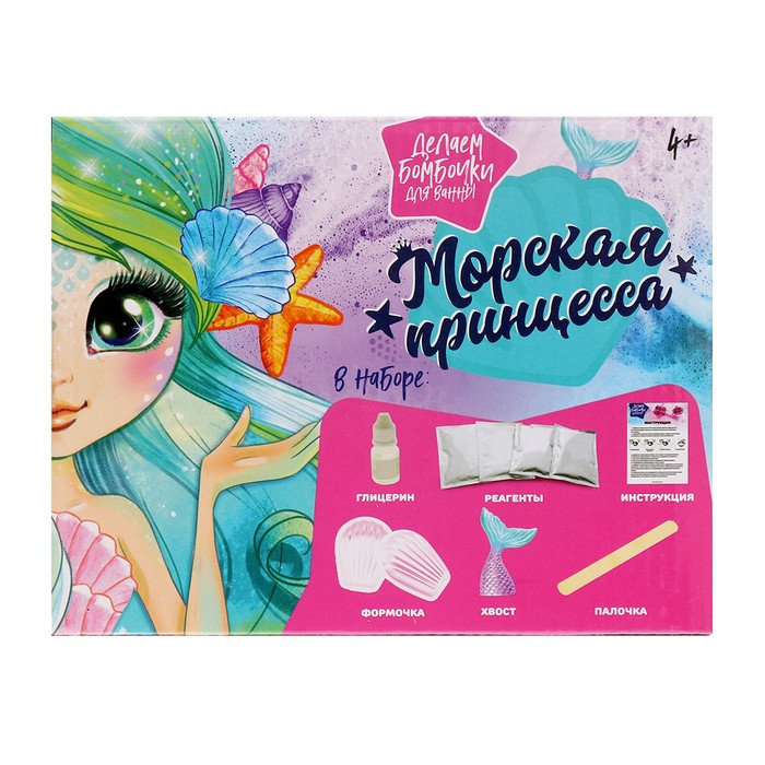С набором для опытов «Морская принцесса» ребёнок проведёт увлекательный эксперимент и самостоятельно сделает 2 бурлящие бомбочки для ванны.