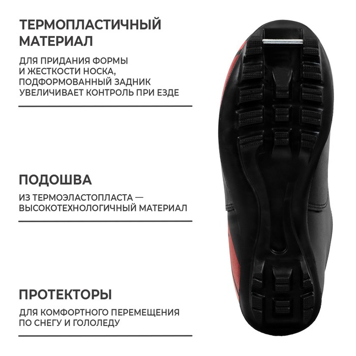 - Состав подошвы: высокотехнологичный термоэластопласт с увеличенным протектором. Дополнительные протекторы на подошве позволяют комфортно перемещаться по снегу и гололёду к месту отдыха и обратно.