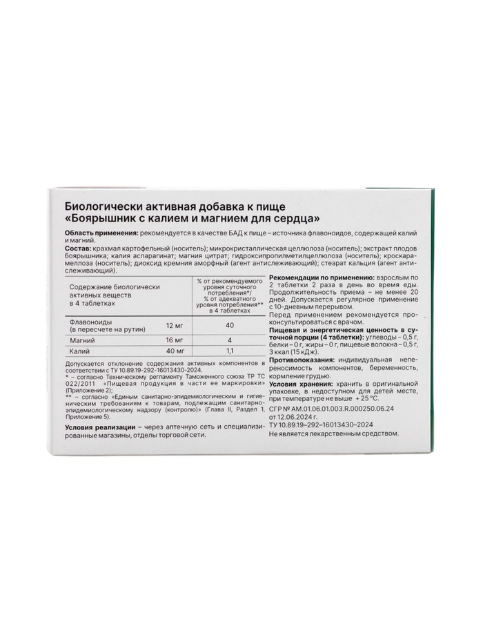 Допускается регулярное применение с 10-дневным перерывом**Состав:** микрокристаллическая целлюлоза и крахмал (носители), экстракт боярышника, калия аспартат, магния лактат, кроскарамеллоза натрия (носитель), диоксид кремния и стеарат кальция (агенты антислеживающие).