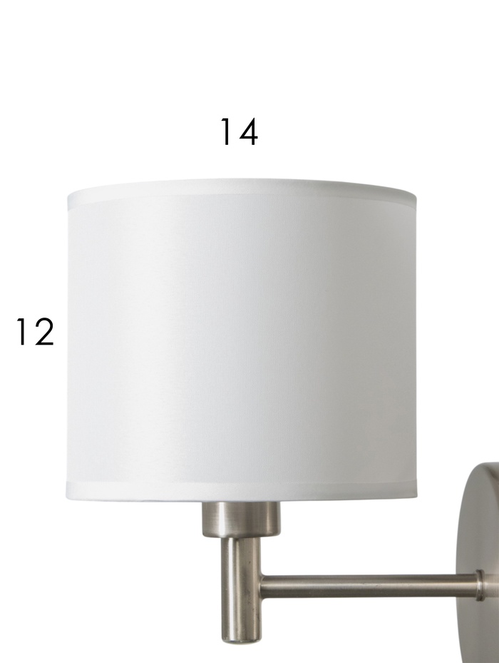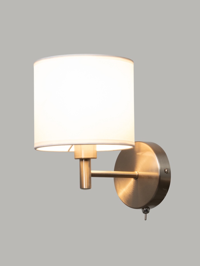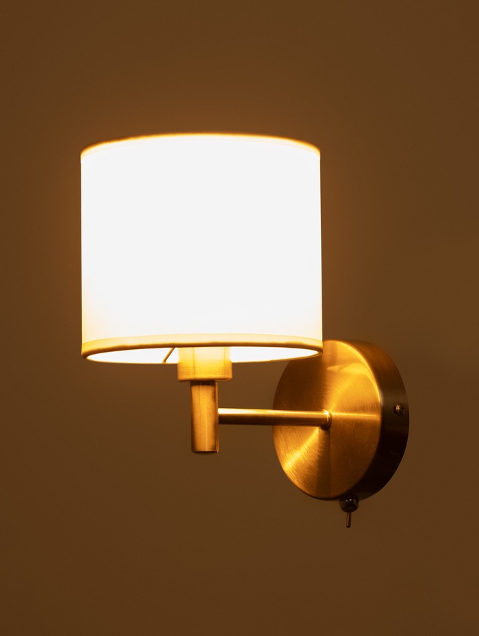Настенное бра с лаконичным силуэтом и текстильным абажуром формирует мягкое локальное освещение, комфортное для отдыха и повседневных задач. Белый плафон деликатно рассеивает свет, создавая спокойную атмосферу без резких теней.