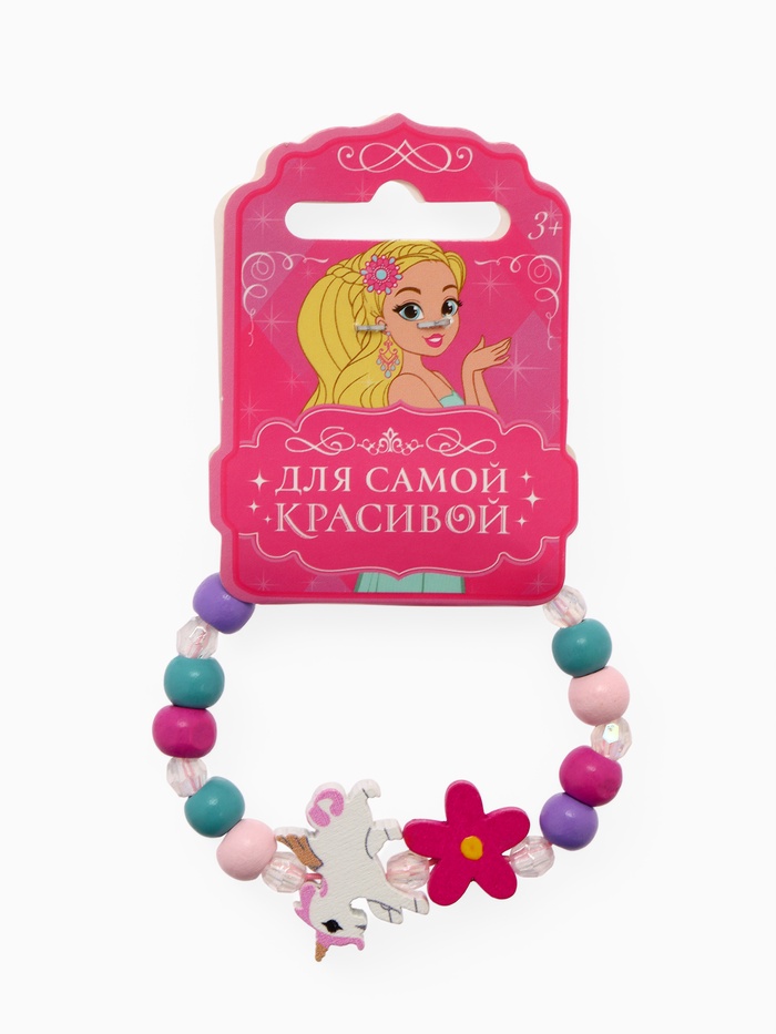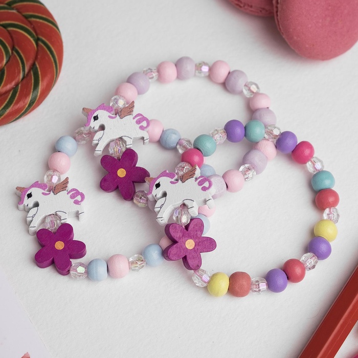 - Однониточный браслет из деревянных и пластиковых бусин с декоративным элементом в виде единорога и цветка.