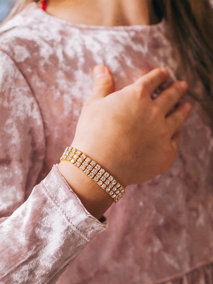 Этот браслет гармонично вписывается в детский гардероб, добавляя лёгкий блеск и утончённость. Белые стразы на золотом фоне создают чистый и свежий образ, который легко сочетается с разными аксессуарами. Аксессуар подчёркивает индивидуальность и помогает завершить образ без усилий.