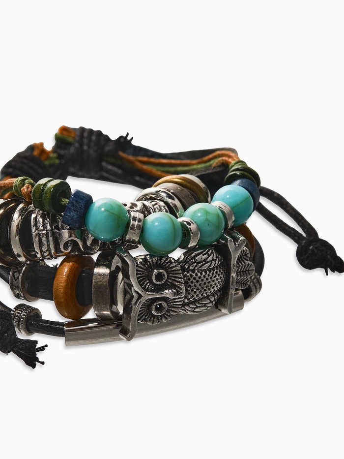 Этот браслет из натуральной и искусственной кожи объединяет в себе утонченность и выразительность, подчёркивая индивидуальность каждой женщины. Чёрное основание с диаметром 9 см создаёт стильный контраст с разноцветными вставками из металла, текстиля, дерева и искусственного камня, а изящная подвеска в виде совы придаёт аксессуару особый символизм и загадочность.