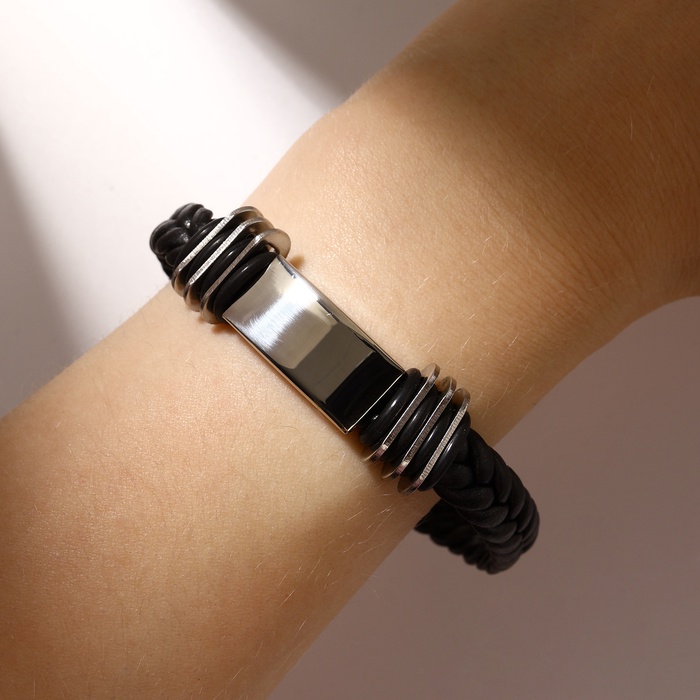 Элегантный и современный браслет с прямоугольной вставкой и косичкой — это гармоничное сочетание стиля и функциональности. Его чёрный кожаный ремешок длиной 22 см аккуратно обнимает запястье, а серебряная фурнитура добавляет изделию изысканности и благородства. Такой аксессуар станет универсальным дополнением как к деловому, так и к повседневному образу, подчеркивая индивидуальность владельца.