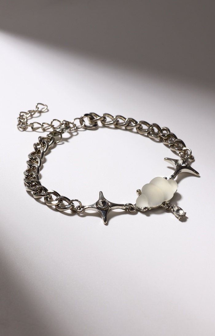 Этот браслет воплощает мечты о звёздных просторах, где белоснежные вставки акрила и полистоуна на серебристой металлической цепочке создают ощущение бесконечного неба. Длина 16 см и удобный карабин позволяют носить его с лёгкостью, подчёркивая элегантность и индивидуальность каждой женщины.