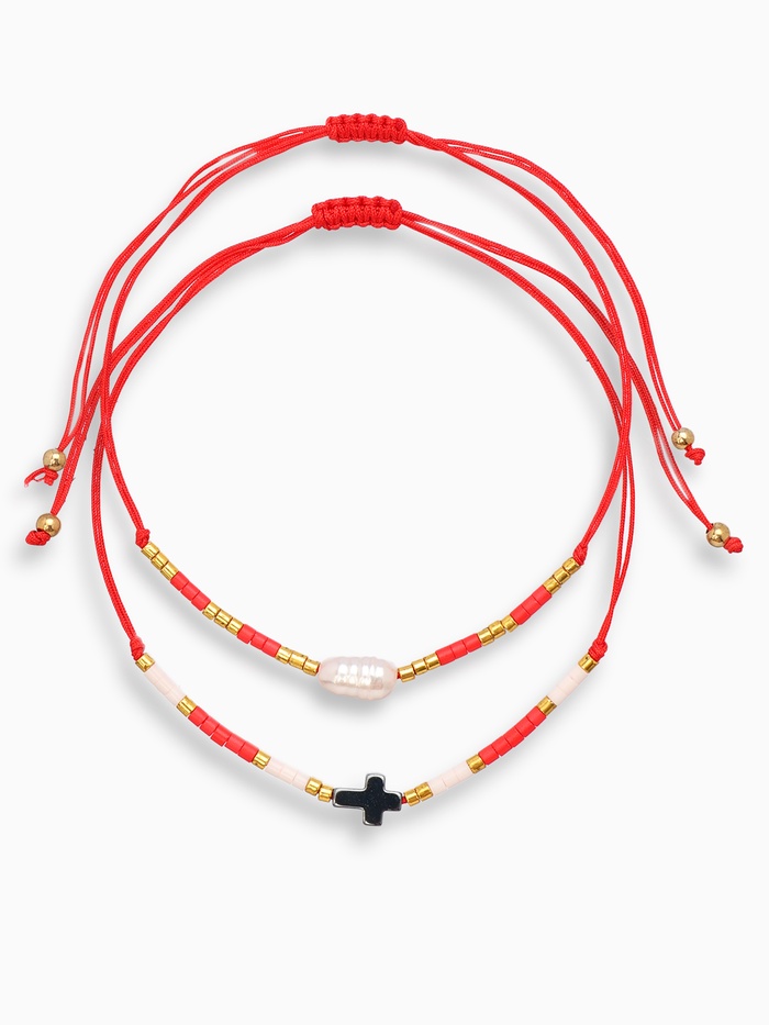 Набор из двух браслетов-оберегов, выполненных из красной нити и украшенных чёрно-белым бисером, воплощает в себе силу традиций и современный стиль. Каждый браслет создан для защиты и привлечения положительной энергии, а универсальный дизайн подходит как мужчинам, так и женщинам.
