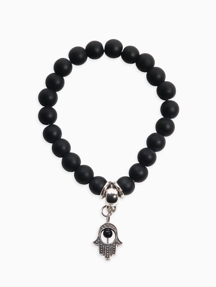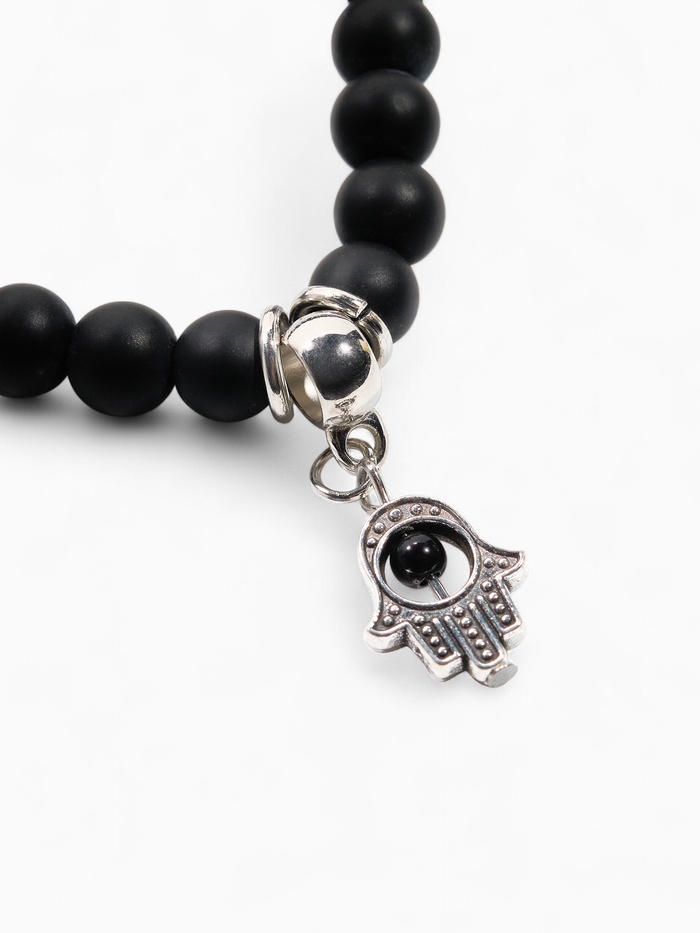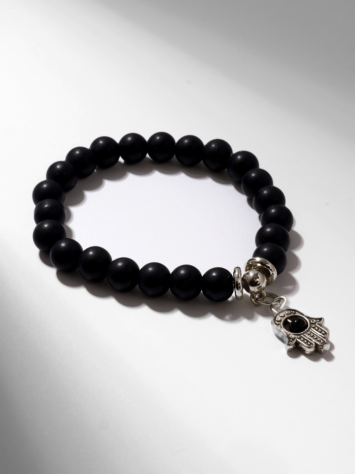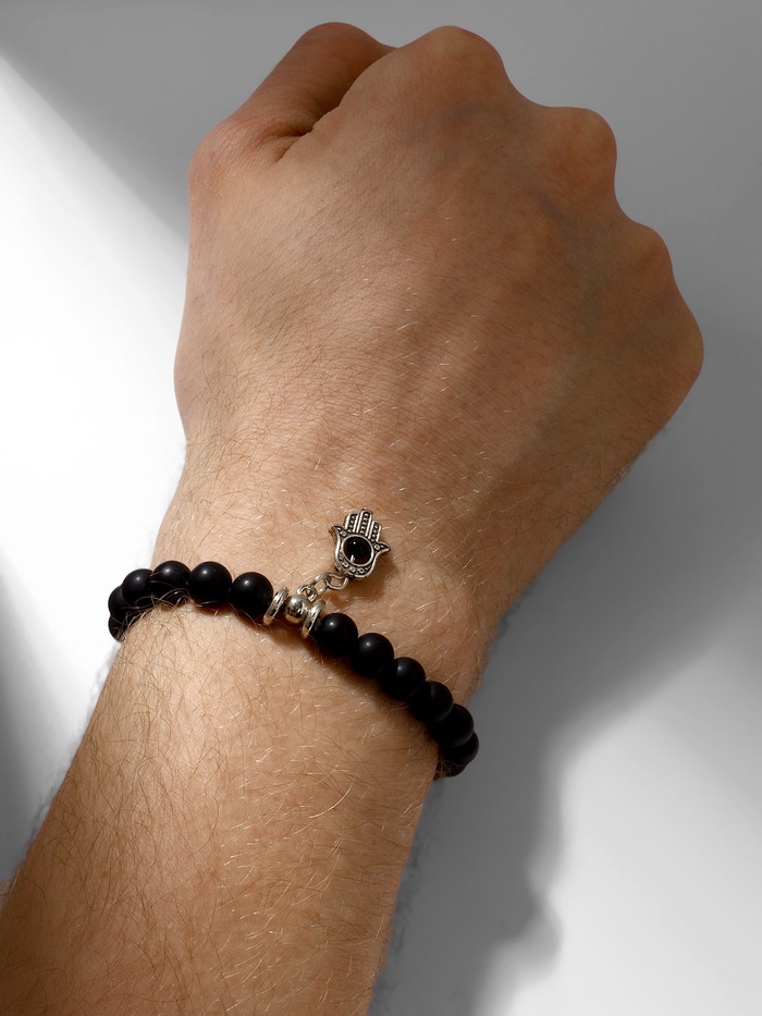 Откройте для себя уникальный браслет-оберег «Рука счастья Хамса», который станет вашим верным амулетом на пути к счастью и гармонии. Этот стильный аксессуар выполнен из искусственного камня в элегантном черном цвете и дополнен серебряной фурнитурой, создавая впечатляющий и современный образ.