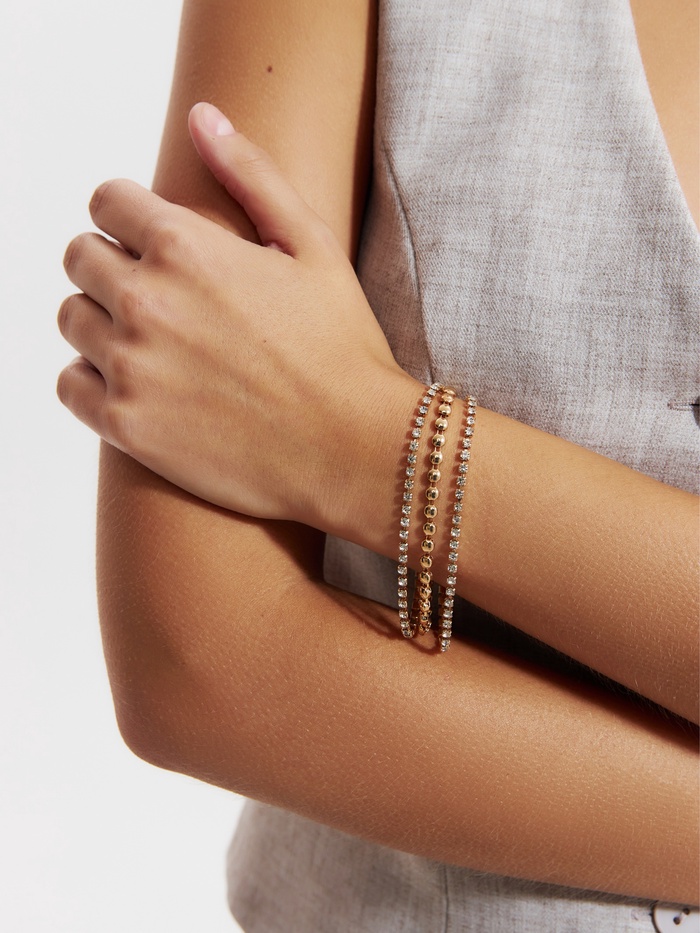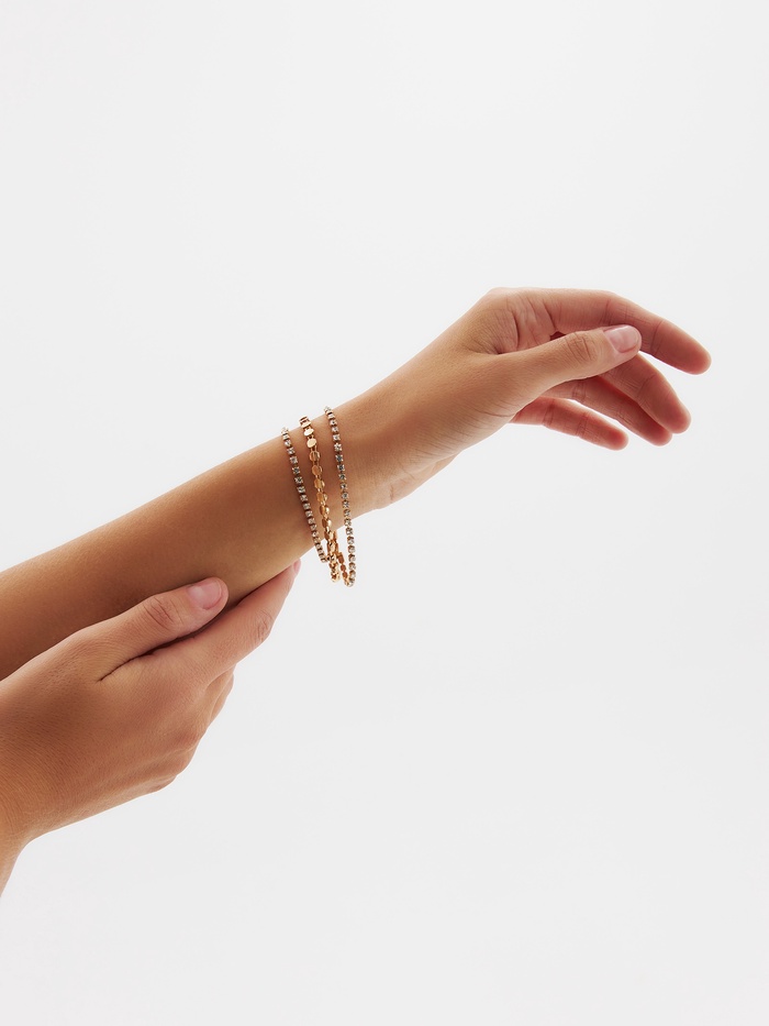 Элегантность и сияние в каждом звене — этот браслет создан, чтобы подчеркнуть изысканный вкус и добавить блеска вашему образу. Изящное сочетание белых страз и золотистого металла на медной основе создаёт эффект легкости и утончённости, идеально подходящий для особых случаев и повседневной носки.