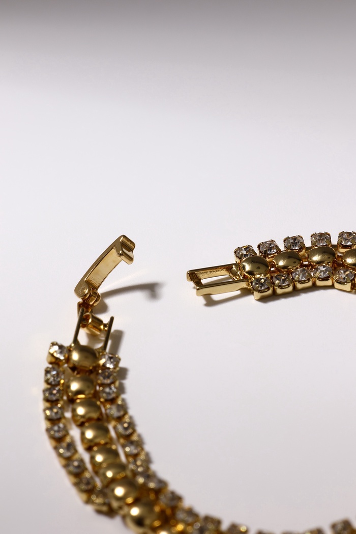 Элегантность и сияние в каждом звене — этот браслет создан, чтобы подчеркнуть изысканный вкус и добавить блеска вашему образу. Изящное сочетание белых страз и золотистого металла на медной основе создаёт эффект легкости и утончённости, идеально подходящий для особых случаев и повседневной носки.