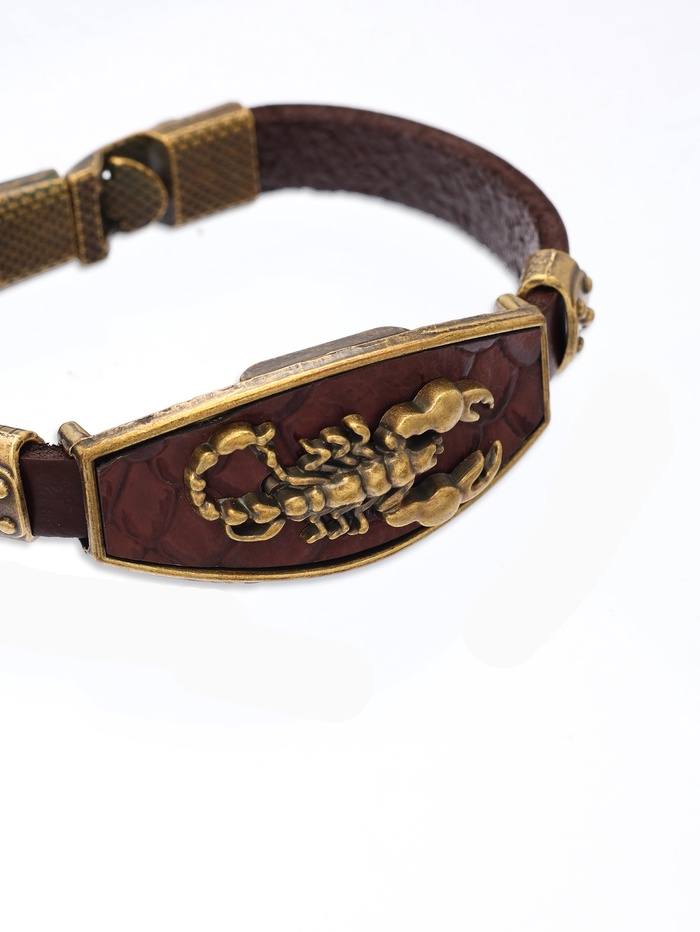 Изготовленный из искусственной кожи с металлическими вставками, этот браслет обладает высокой прочностью и долговечностью. Тематика скорпиона — знак зодиака, символизирующий страсть, трансформацию и внутреннюю энергию — делает его не только стильным украшением, но и амулетом, приносящим удачу и уверенность. Его универсальный дизайн легко сочетается с различными стилями одежды, добавляя образу загадочности и харизмы.