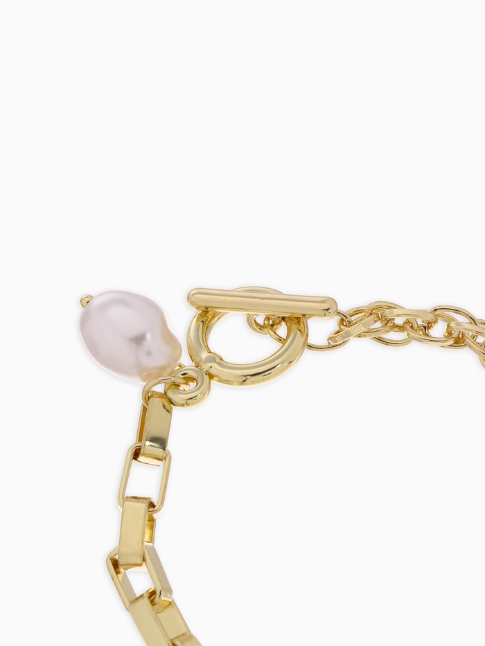 Откройте для себя элегантность и утонченность с этим замечательным браслетом, который станет идеальным дополнением к вашему образу. Изготовленный из качественного металла и украшенный белым жемчугом в золотой обрамлении, он длиной 20 см придаст вашему стилю изысканный шарм и неповторимость.