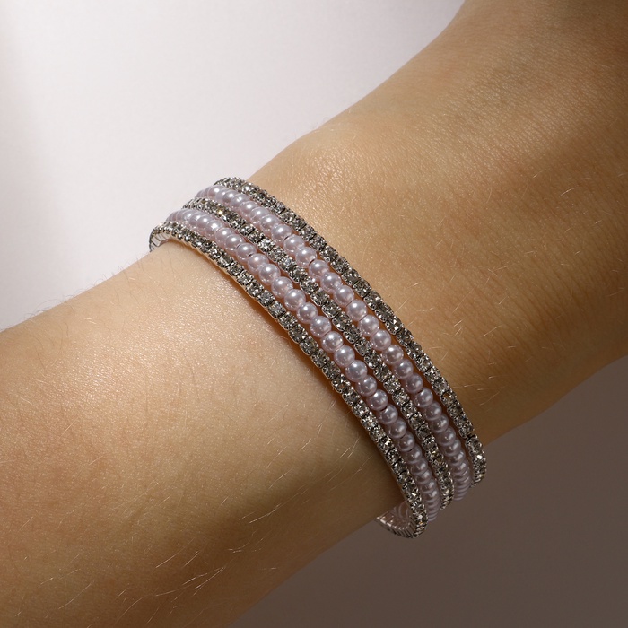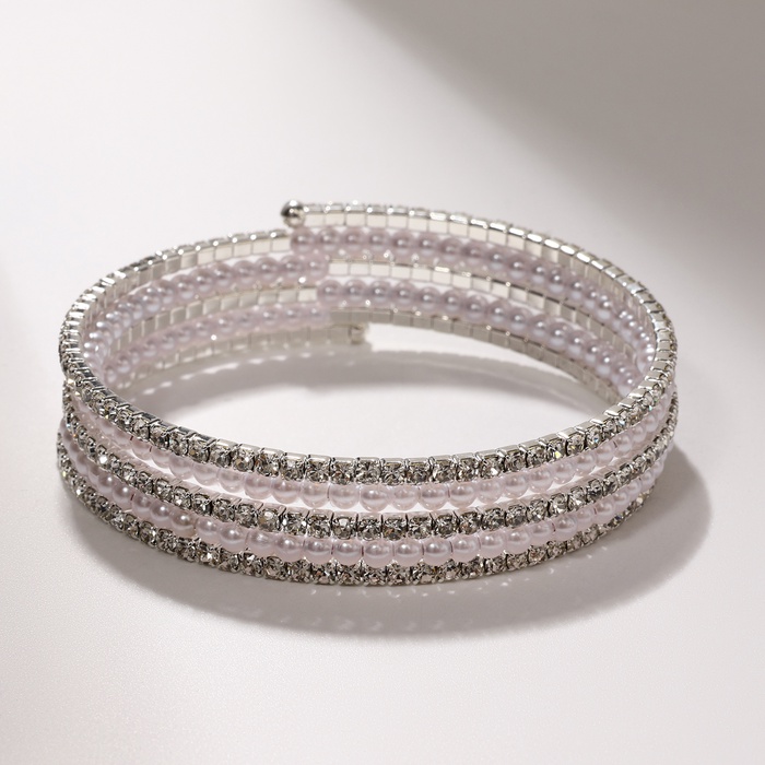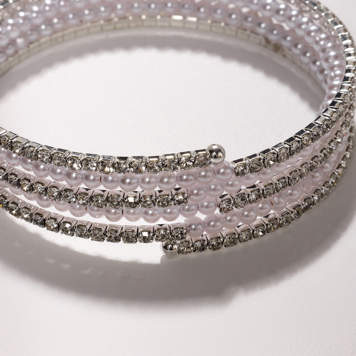Браслет-пружинка с серебристой фурнитурой – это стильное украшение, которое подчеркнет элегантность и изысканность любого образа. Выполненный из гипоаллергенного бижутерного сплава, он подойдет даже обладательницам чувствительной кожи. Браслет украшен вставками из ненатурального жемчуга и сверкающих страз, придающих ему блеск и праздничный вид. Диаметр 5,5 см позволяет браслету удобно садиться на запястье и не сдавливать его.