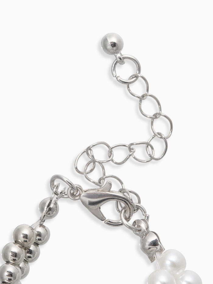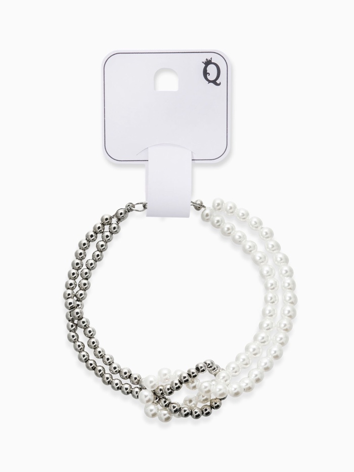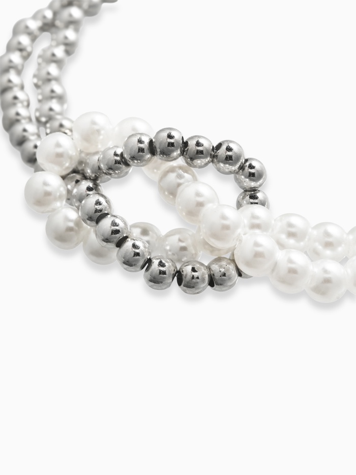 Белоснежные жемчужинки, будто маленькие луны, мягко мерцают на фоне деликатного металлического плетения. Этот изысканный комплект состоит из двух браслетов разной длины, позволяя экспериментировать с созданием многослойных образов.