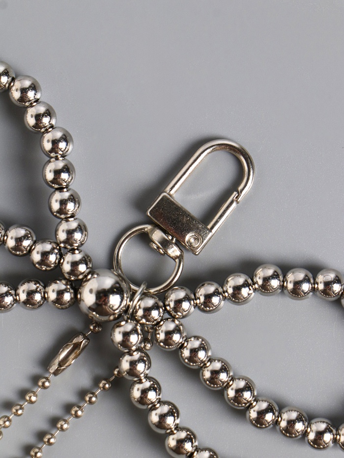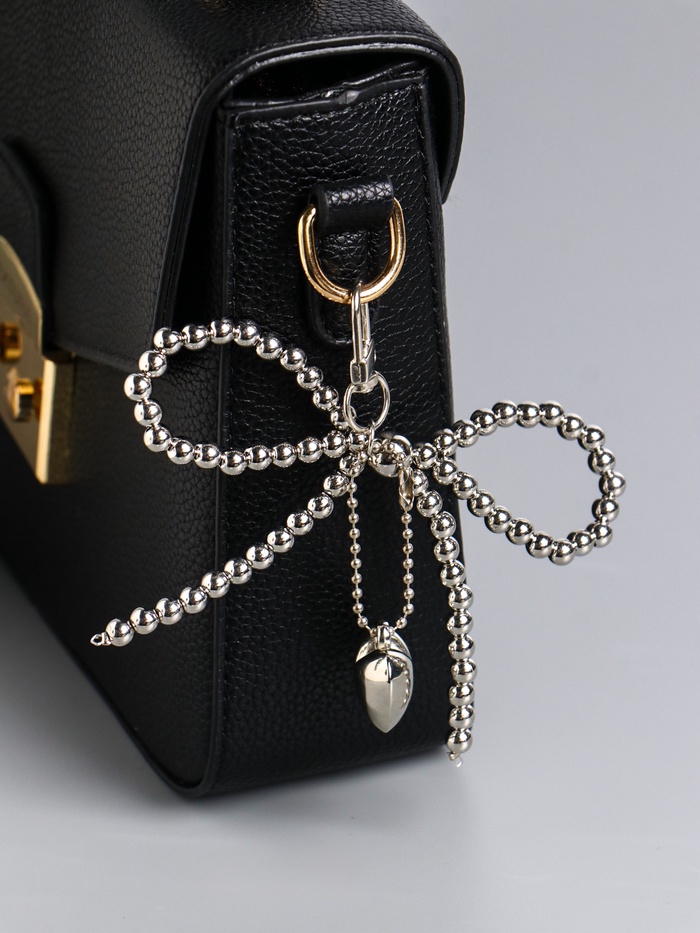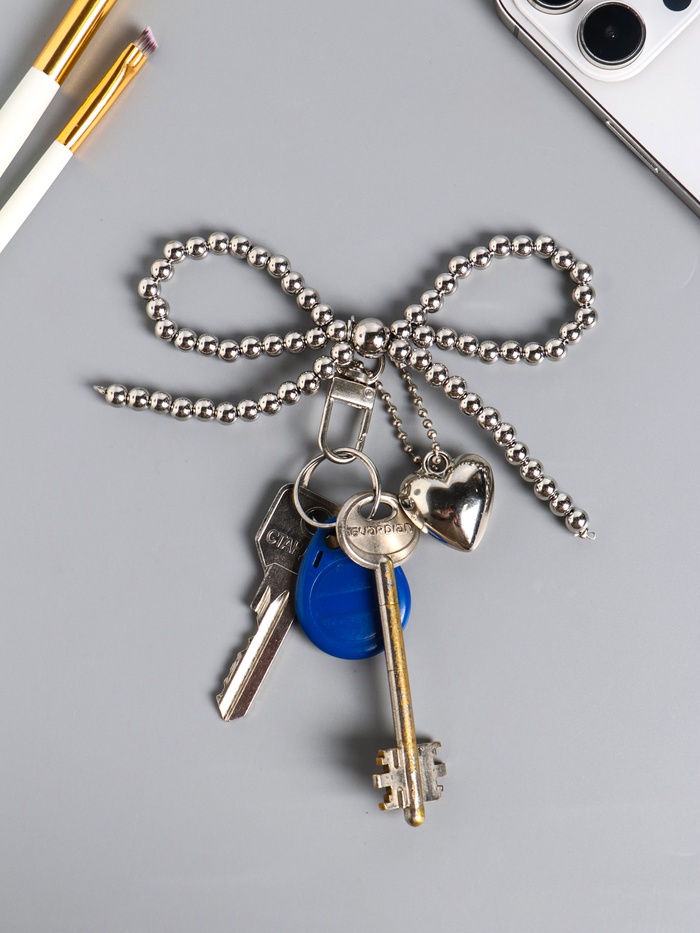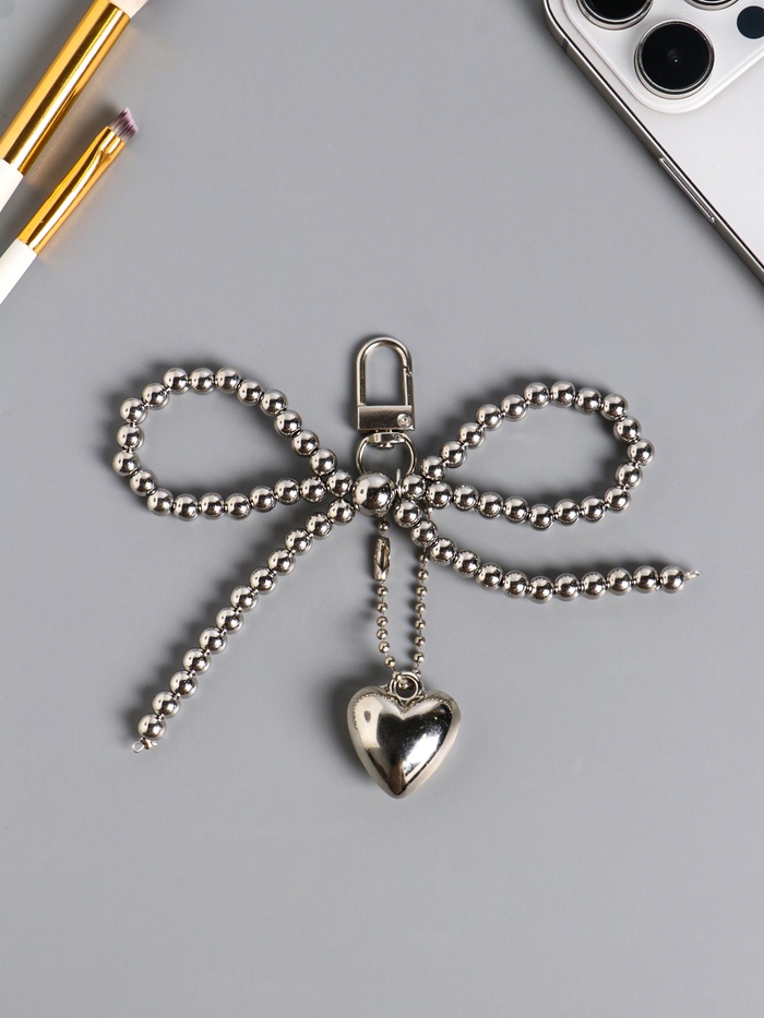 Брелок на карабине "Бант и сердце" серебро, бусины d=0,5 см сердце 2,7х3х1,5 12х12х1,5 см