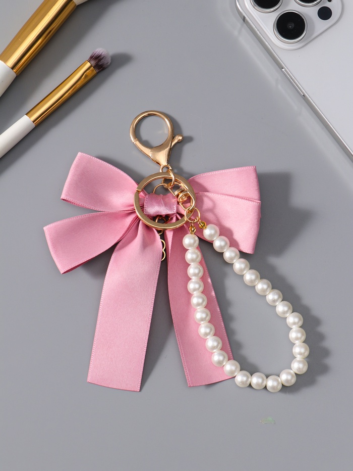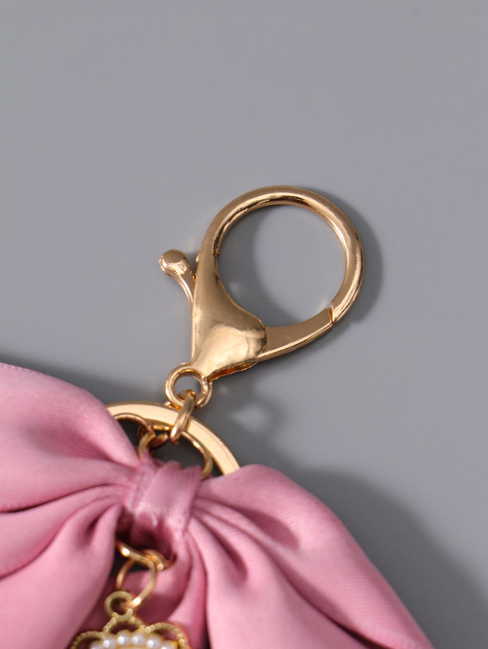 Брелок на карабине "Двойной бант с жемчугом и подвеской" розово-белый 13х8,5х1 см