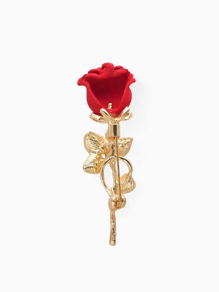 Женственный акцент с природным мотивом. Изящная брошь в виде розы с красно-зелёными эмалевыми лепестками и золотистым основанием станет эффектным дополнением образа.