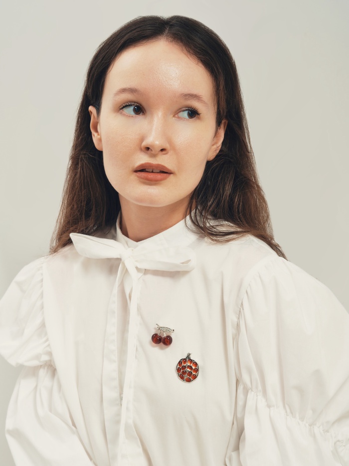 - Элегантный дизайн: брошь в виде граната с косточками привносит в ваш стиль нотку оригинальности и свежести, делая её идеальным аксессуаром для любого наряда.