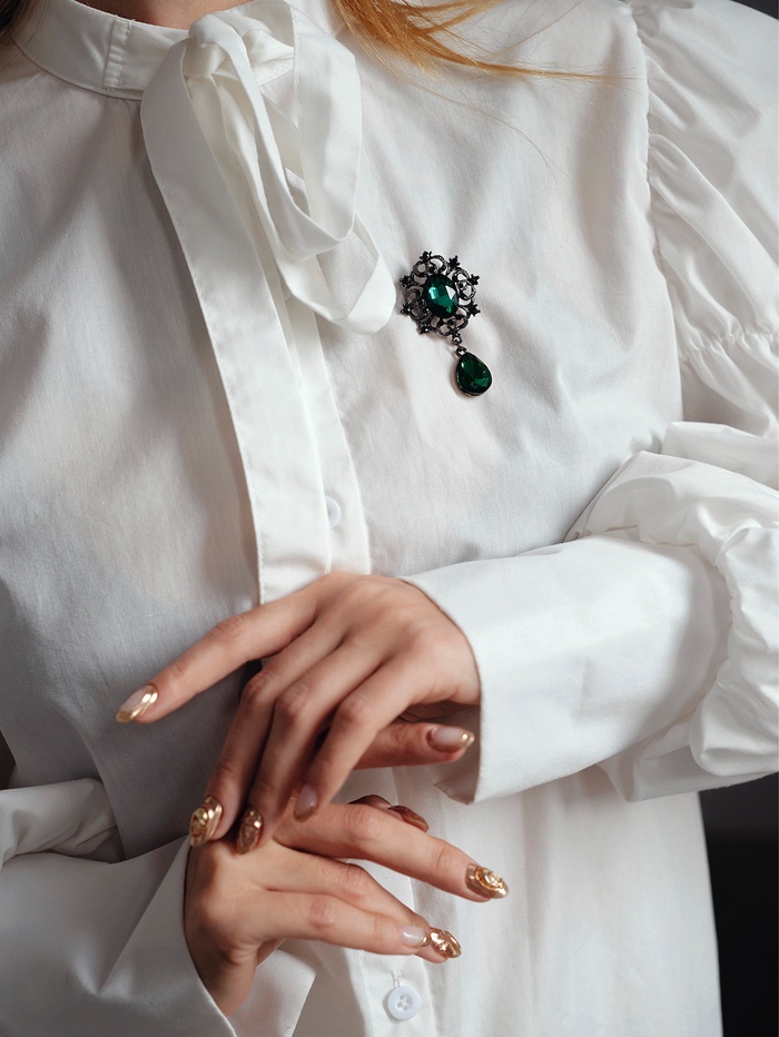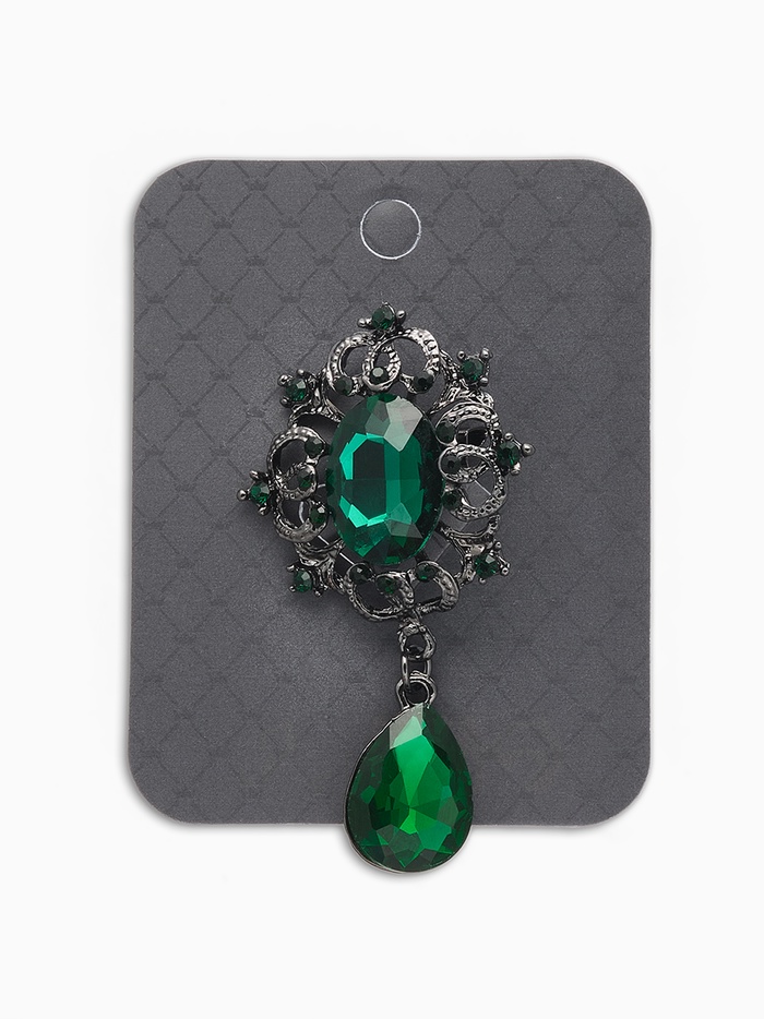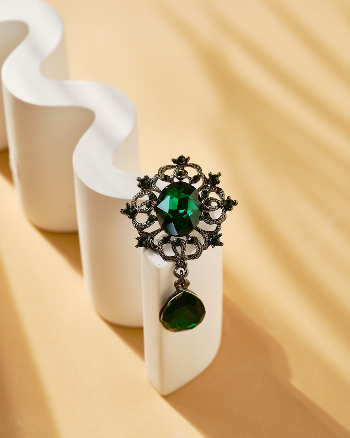 Изумрудная брошь с изящными вензелями на сером металлическом основании — воплощение утончённого винтажного стиля и элегантности. Длина 6 см подчёркивает изысканность изделия, делая его заметным акцентом в образе, но при этом сохраняет лёгкость и гармоничность.