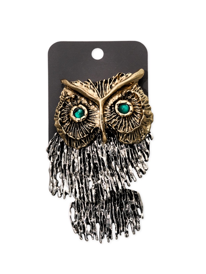 Знакомьтесь с оригинальной брошью в виде крупной разноцветной совы, изготовленной из металла с использованием золота и стразов. Образ мудрого ночного существа приобретает красочные оттенки и буквально оживает на вашей одежде.