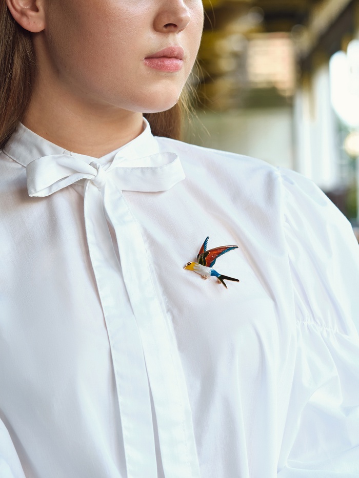 Детальная проработка формы птицы и насыщенные цвета эмали подчёркивают лёгкость и динамичность дизайна, символизируя свободу и надежду. Эта брошь отлично дополнит как повседневный, так и праздничный наряд, особенно актуальна в качестве подарка к 8 Марта — универсальный выбор для мамы, сестры, подруги или коллеги.