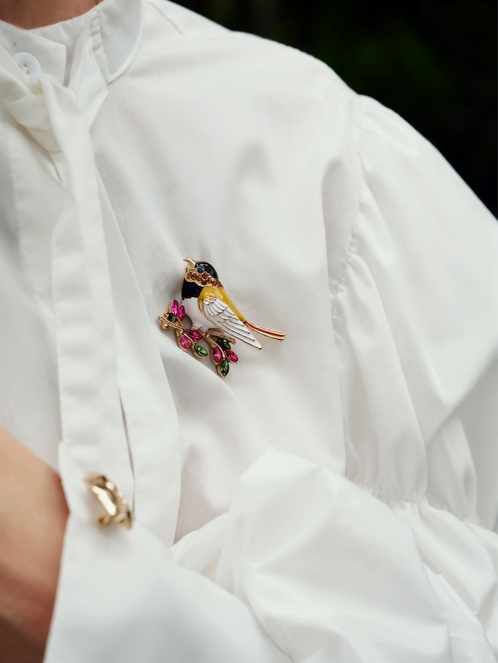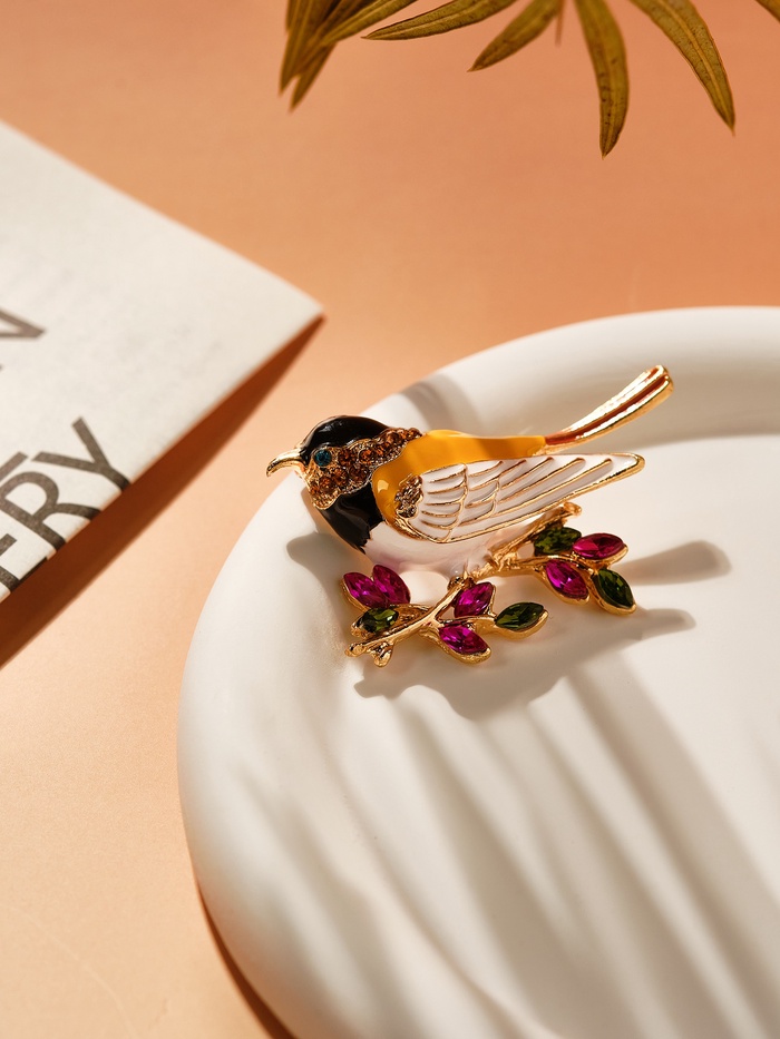 Изящная брошь с изображением птички-синички в золотистой оправе привнесёт в образ лёгкость и яркость. Её длина всего 4,5 см, что делает изделие универсальным аксессуаром для женщин любого возраста — от внучек до бабушек. Разноцветная эмаль, украшенная блеском страз и стеклянных вставок, придаёт броши живописность и выразительность.