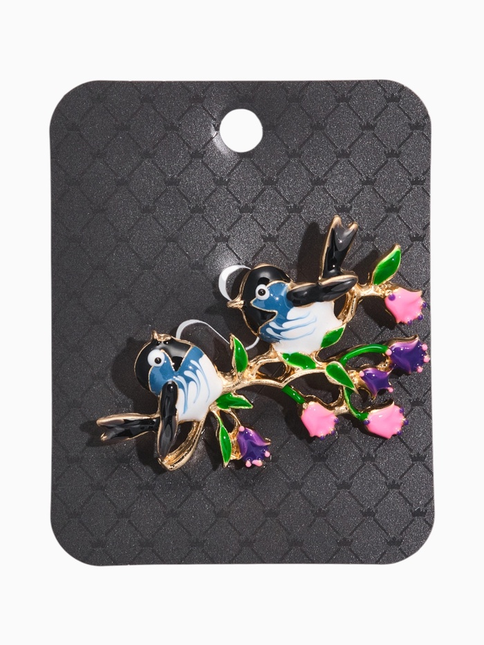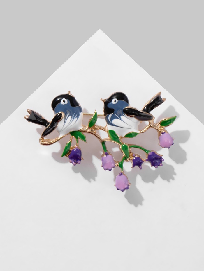 Брошь «Птички» на цветочной ветви, цветная в золоте