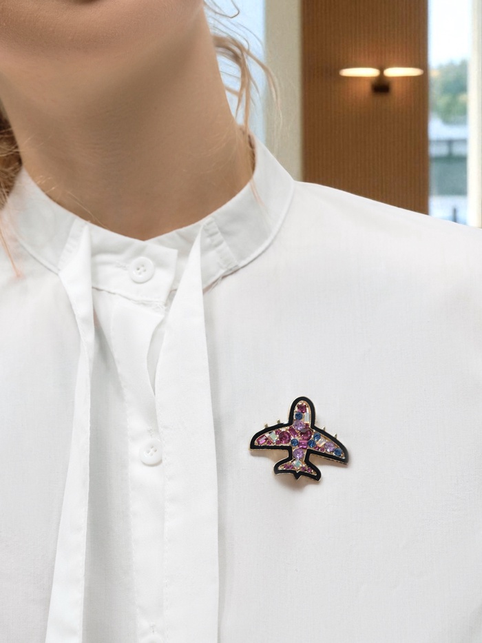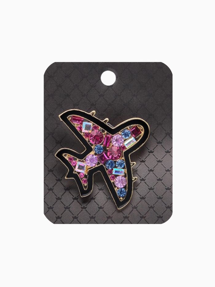Эта изящная брошь в виде самолёта станет ярким акцентом в вашем образе, добавляя нотку динамики и оригинальности. Выполненная из прочного металла с золотистым покрытием, она сочетает в себе стиль и долговечность, а разноцветные эмалевые вставки и блестящие стразы придают изделию особое сияние и глубину цвета.