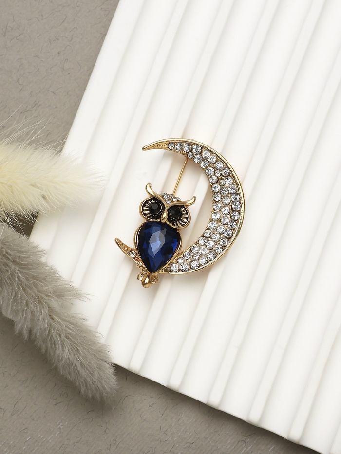 Эта изящная брошь с изображением совы на фоне месяца притягивает взгляд своей гармонией белого и синего оттенков, обрамлённых золотистой фурнитурой. Композиция словно рассказывает историю мудрости и ночной загадочности, придавая образу глубину и утончённость.