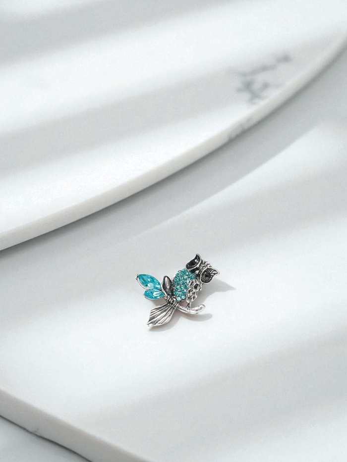 Откройте для себя удивительный мир стиля и символики с этой очаровательной брошью в форме совы, сидящей на ветке. Нежный голубой цвет в сочетании с чернёным серебром создаёт гармоничный образ, который прекрасно дополнит любой наряд, от повседневного до вечернего.
