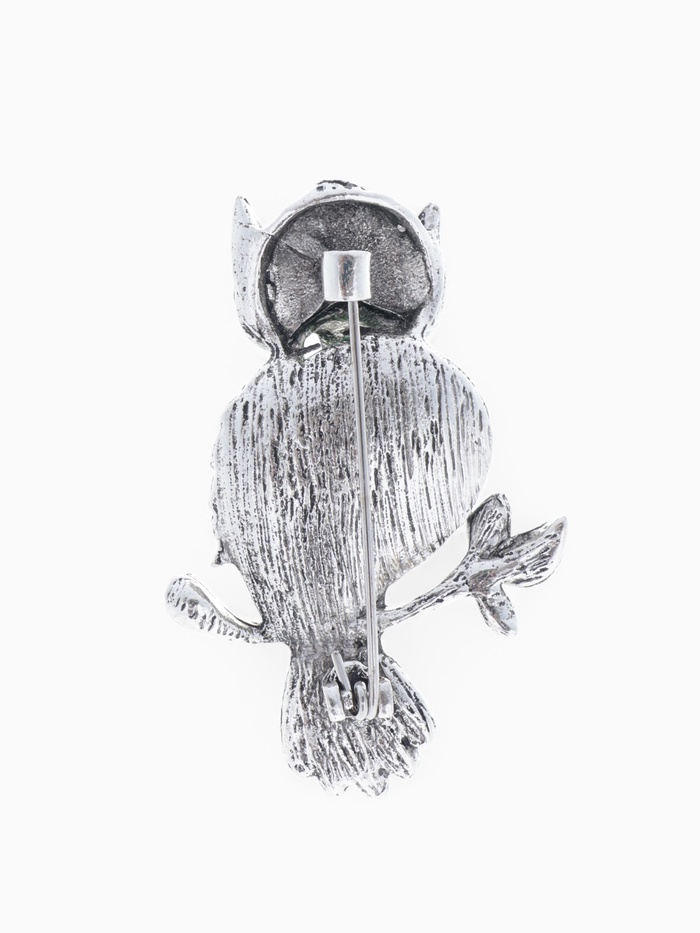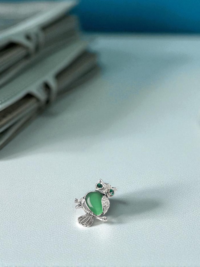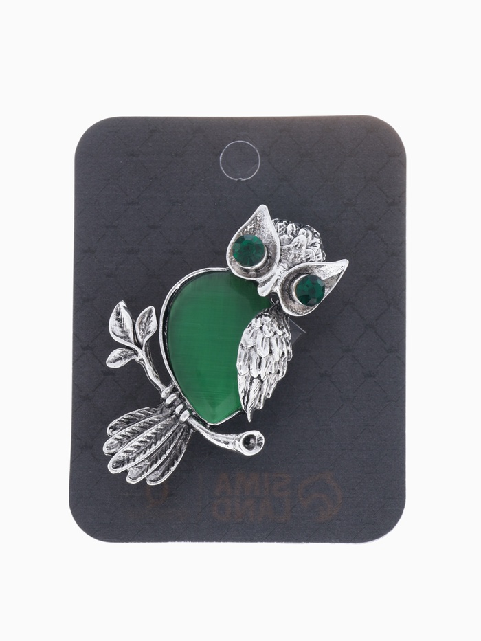 Брошь с изображением совы в зелёных тонах на основе из чернёного серебра станет выразительным акцентом в вашем образе. Размер изделия — 5 см, что делает её заметным, но при этом аккуратным украшением для женщин любого возраста.
