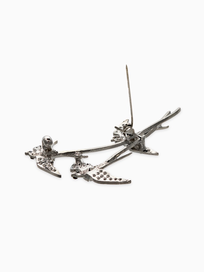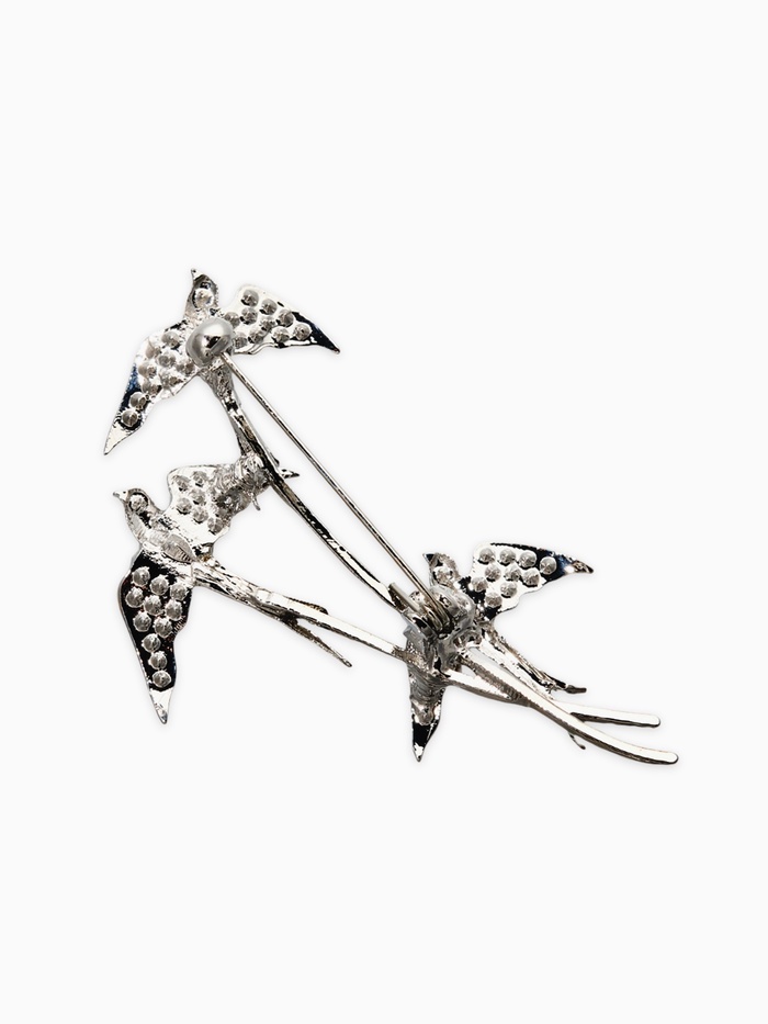 Эта брошь превращает мастерство в искусство, яркое и элегантное решение для женщин, которые ценят гармонию и природную красоту. Три изящных ласточки, выполненные из металла с белым покрытием, словно в полёте, создают образ легкости и свободы, подчеркивая утонченность и индивидуальность носительницы.