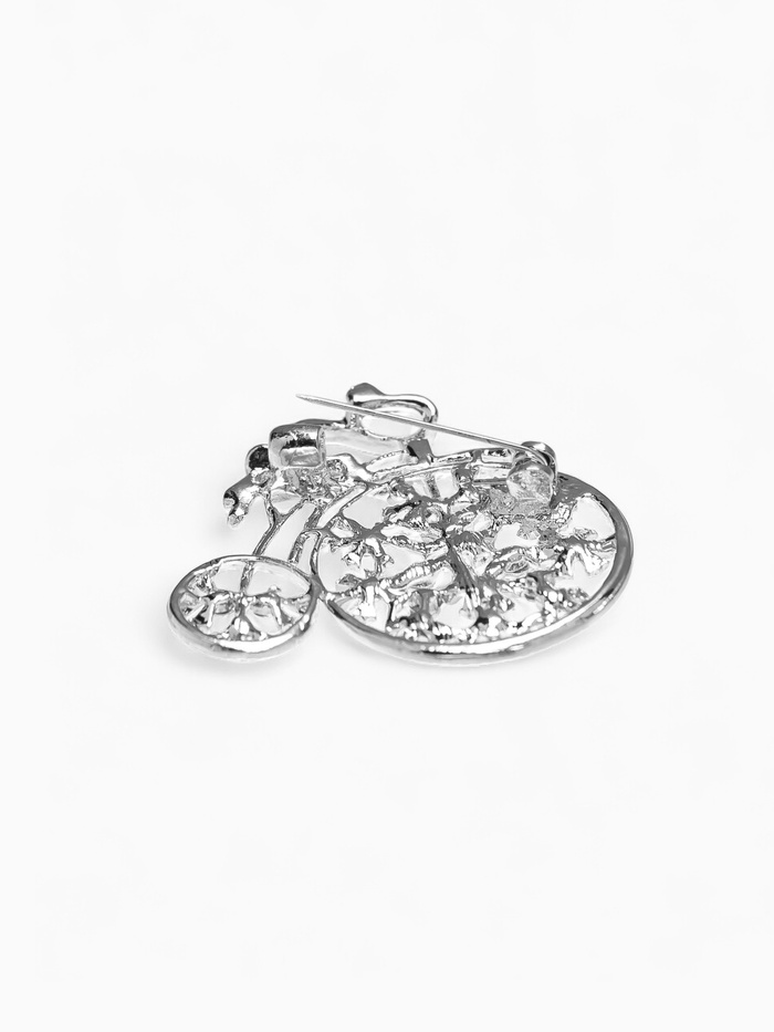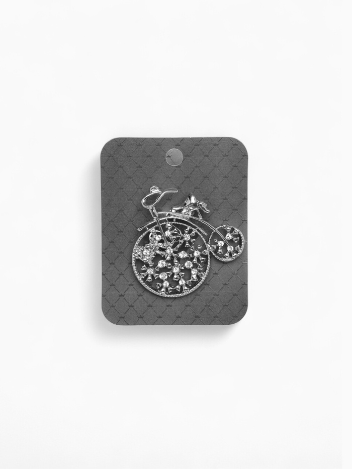 Откройте для себя уникальное украшение, которое добавит нотку ретро-стиля в ваш образ — брошь в форме велосипеда. С белой вставкой из страз и серебристым металлическим основанием, эта брошь станет не только стильным аксессуаром, но и символом свободы и приключений на двух колесах.