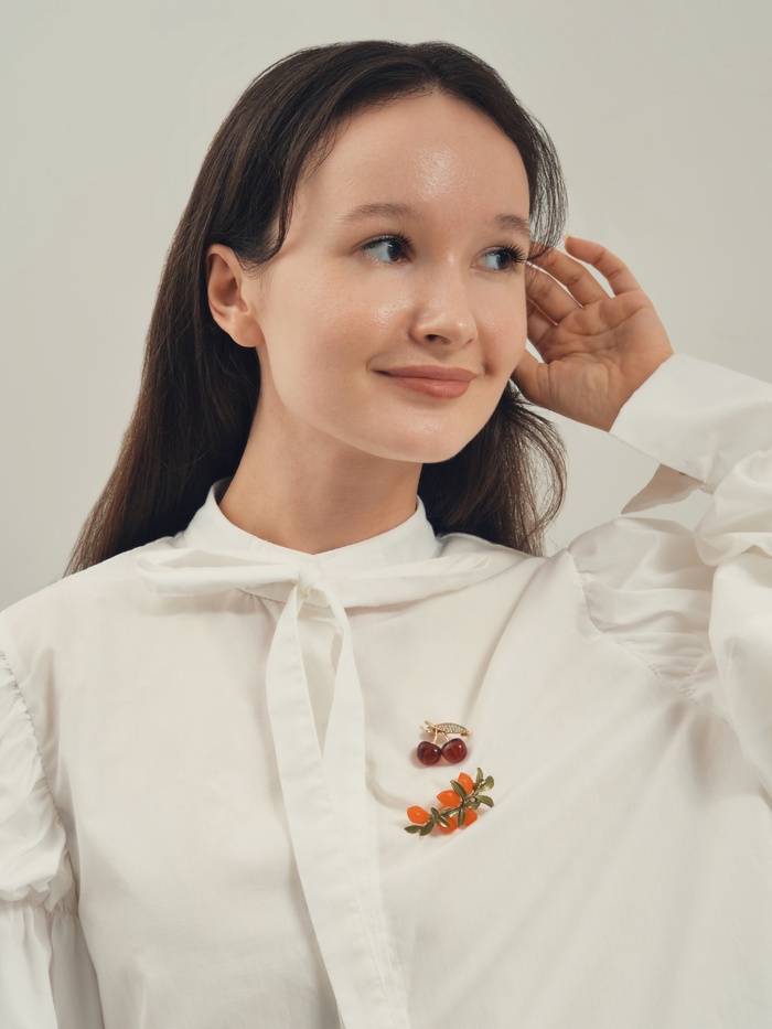 Небольшая, но выразительная брошь с красно-белыми наливными вишнями и золотистым основанием станет эффектным акцентом вашего образа. С длиной всего 2,9 см она идеально подходит для деликатного украшения одежды, придавая ей свежесть и игривость.