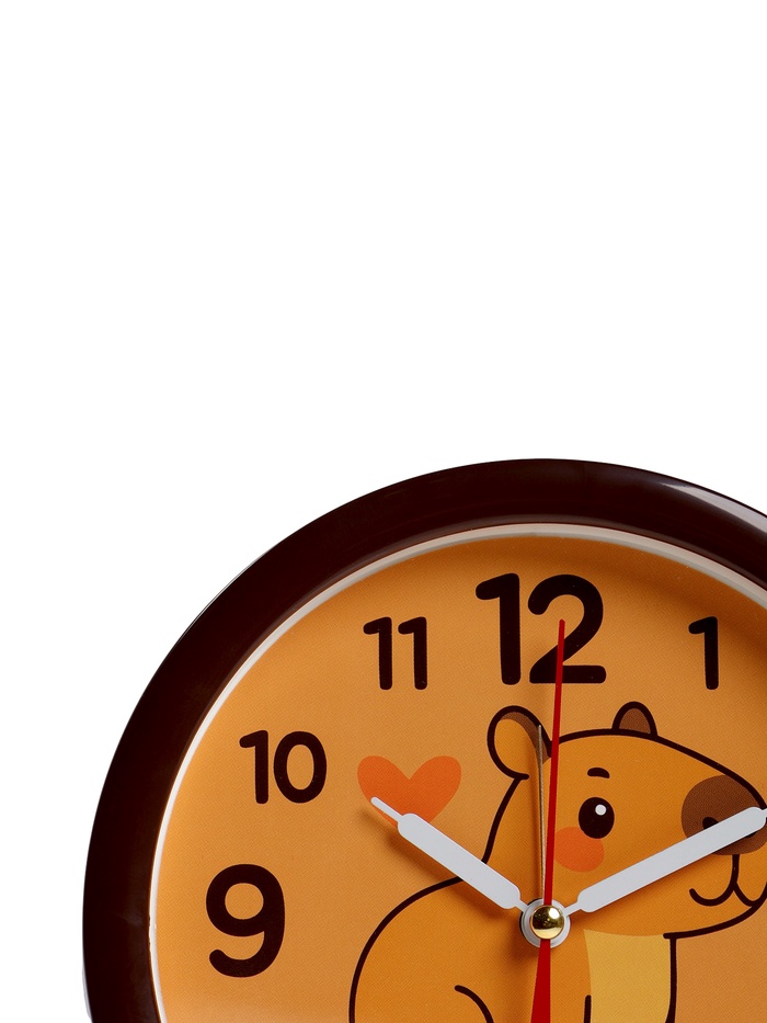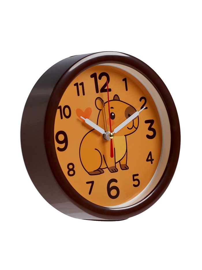 Кварцевый механизм обеспечивает точное время, а плавное движение стрелок работает тихо и нежно, идеально для мягкого пробуждения ребёнка без резких звуков. Оранжевый цвет циферблата ярко и привлекательно контрастирует с коричневым корпусом, облегчая считывание времени в игровой форме. Изображение капибары, выполненное в милых тонах, символизирует дружбу и приключения, помогая детям ассоциировать утро с позитивными эмоциями и снижая утренний стресс.