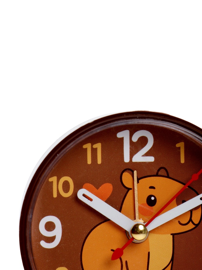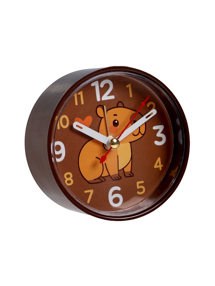 Этот будильник добавляет нотку природного спокойствия в вашу комнату благодаря дизайну с изображением капибары, которая символизирует миролюбие и релакс. Круглый коричневый корпус диаметром 8 см органично вписывается в уютные интерьеры, а коричневый циферблат с чёткими делениями обеспечивает удобное отслеживание времени. Плавный ход стрелок гарантирует бесшумную работу, делая каждое утро по-настоящему комфортным.