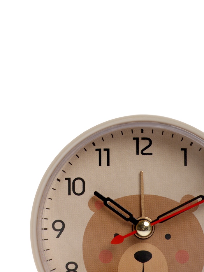 Этот будильник привносит тепло и уют в повседневную рутину благодаря своему милому дизайну с изображением медвежонка, который станет источником хорошего настроения с утра. Круглый бежевый корпус диаметром 8 см идеально гармонирует с нежными интерьерами, а бежевый циферблат с чёткими метками времени обеспечивает лёгкое считывание показаний в любой обстановке. Плавный ход стрелок дарит тишину и спокойствие, делая пробуждение максимально комфортным.